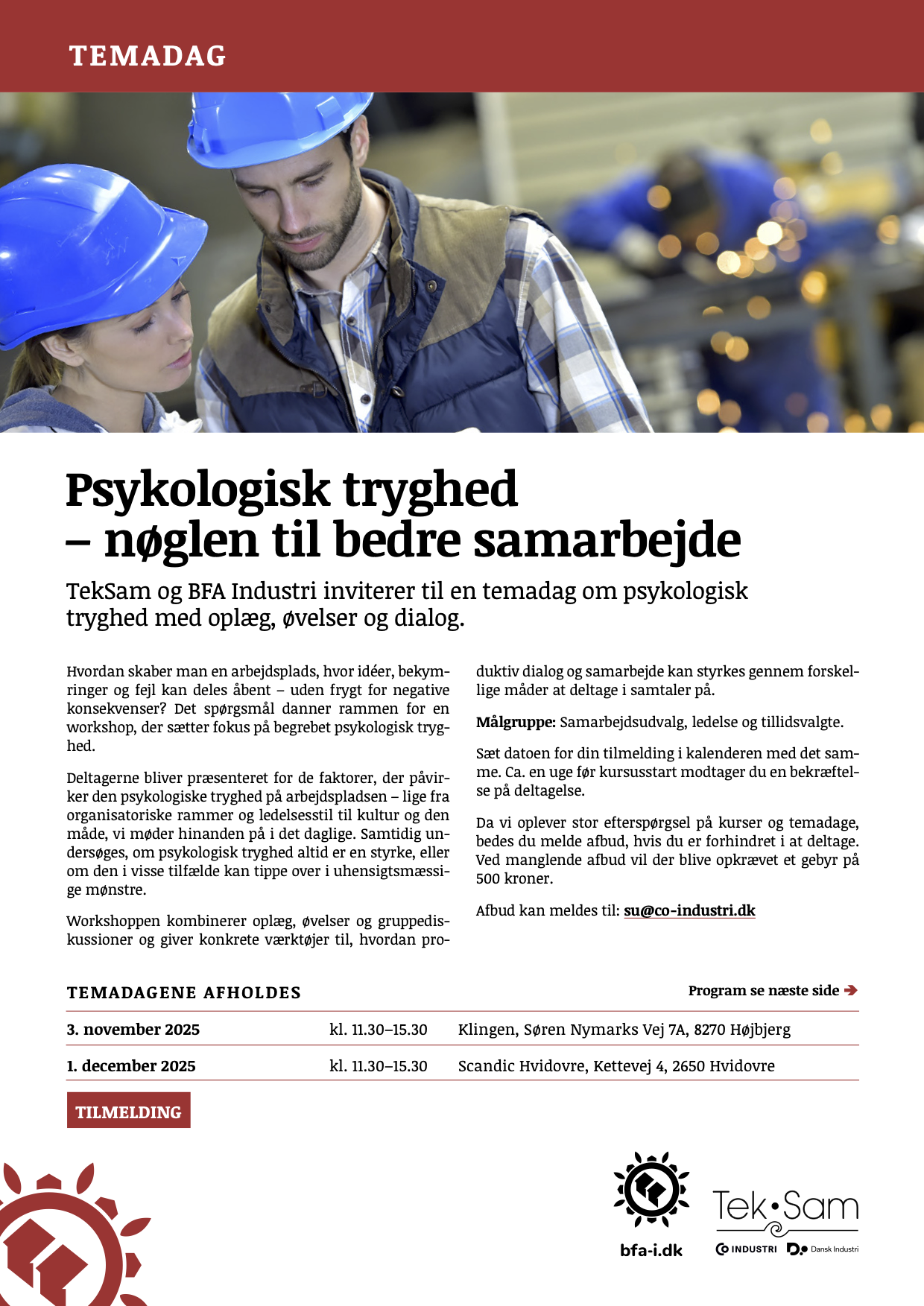 TekSam og BFA Industri inviterer til en temadag, Hvor vi arbejder med hvordan skaber man en arbejdsplads, hvor idéer, bekymringer og fejl kan deles åbent – uden frygt for negative konsekvenser?
