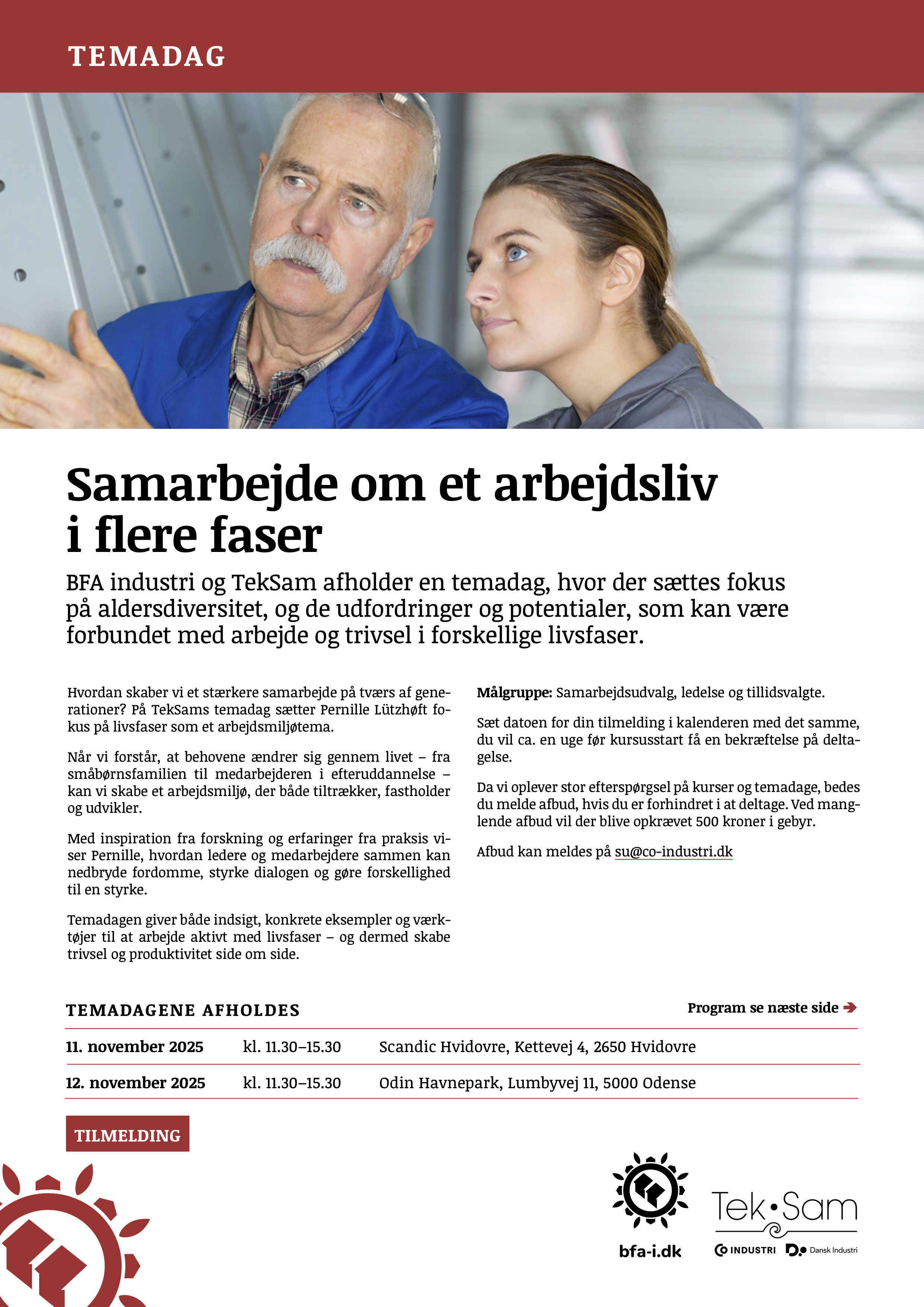 TekSam og BFA Industri inviterer til en temadag, hvor der sættes fokus på aldersdiversitet, og de udfordringer og potentialer, som kan være forbundet med arbejde og trivsel i forskellige livsfaser.